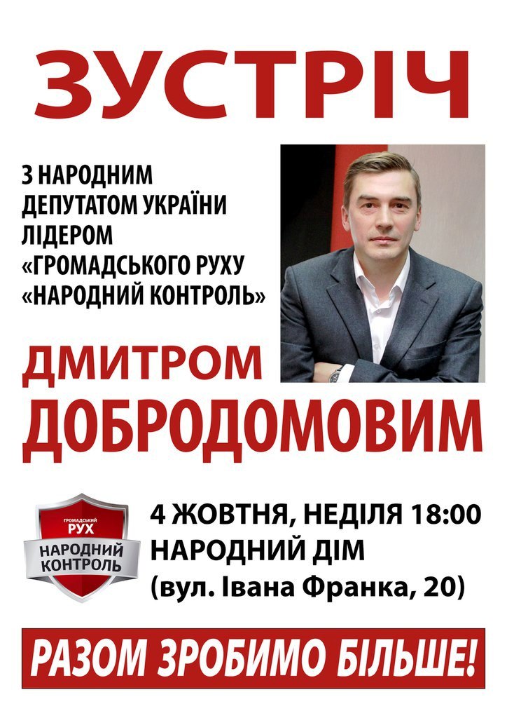 У неділю, 4 жовтня, в Дрогобичі у приміщенні Народного Дому, що на вул. Івана Франка, 20, о 18.00 дрогобичани матимуть змогу зустрітися з народним депутатом України, секретарем Комітету Верховної Ради України з питань запобігання і протидії корупції, лідером «Громадського руху «Народний контроль» Дмитром Добродомовим. Про це інформує Дрогобицька міська організація політичної партії “Громадський рух “Народний контроль”.
