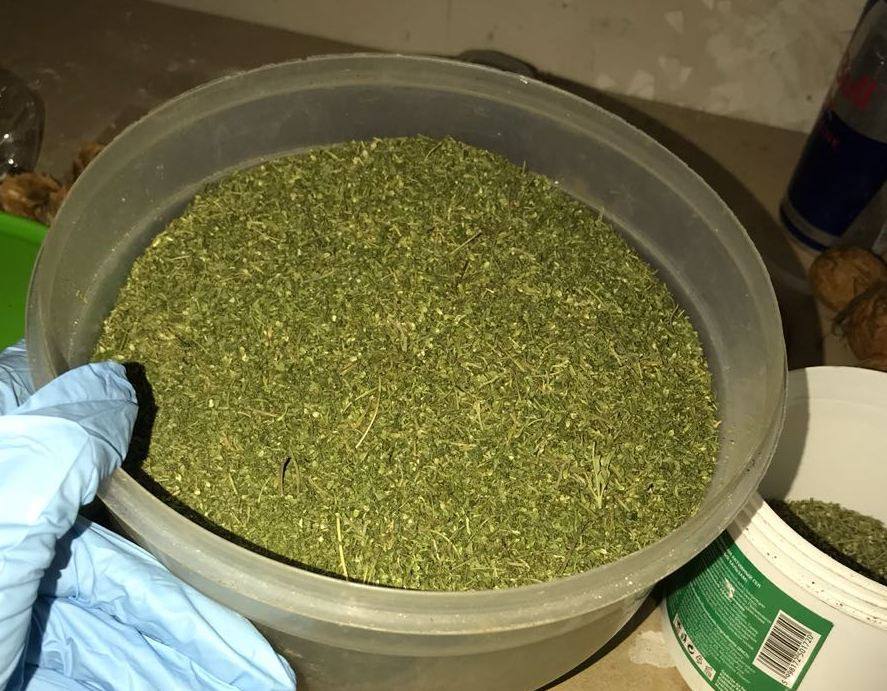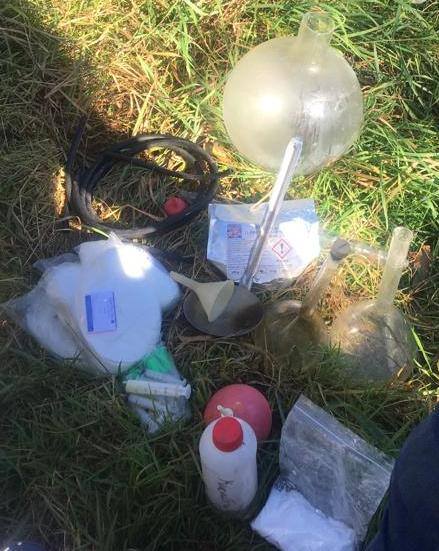 Під час санкціонованого обшуку в господарських приміщеннях зловмисника виявлено і вилучено обладнання та інгредієнти для виготовлення психотропної речовини «амфетамін», а саме: колби, трубки, хімічні реактиви, розчинники, фольгу, градусники, шприци, чималу кількість порошкоподібної речовини, схожої на амфетамін Також у будинку зберігалися поліетиленові пакети та пластикові ємкості з речовиною зеленого кольору рослинного походження, ззовні схожою на канабіс, прекурсори, фольгові згортки та електронні ваги.