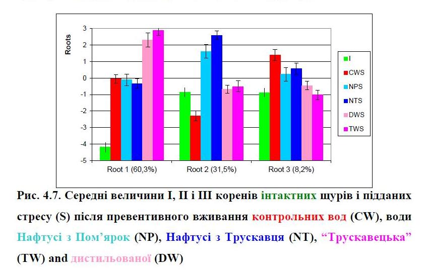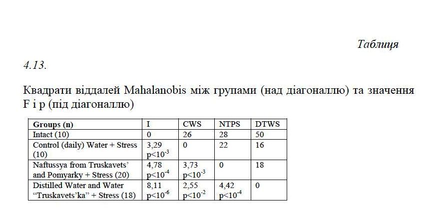 In an experiment on rats of both sexes showed that preventive weekly consumption Naftussya as Truskavets’ and Pomyarky deposits minimizes caused by acute immobilization cold stress erosive and ulcerative damages of gastric mucosa and pathogenic changes in 10 parameters of neuroendocrine-immune complex and metabolism and prevents abnormalities yet 5 indicators, but does not affect post stressory pathogenic deviation 7 other parameters. However, bioactive water Naftussya increases or initiates compensatory and sanogene effects of stress, aimed at enhancing the antimicrobial protection.