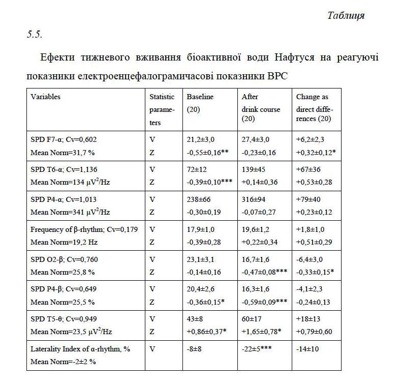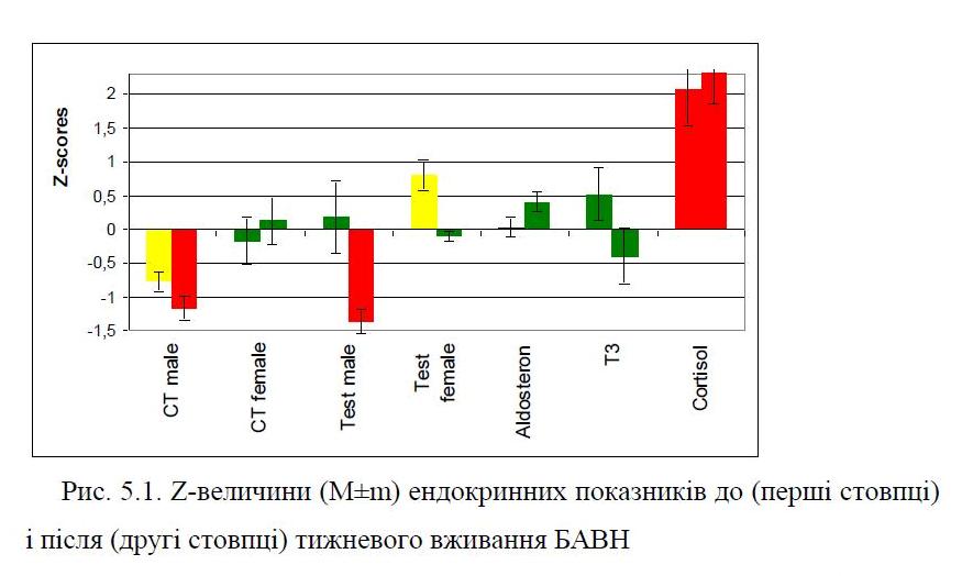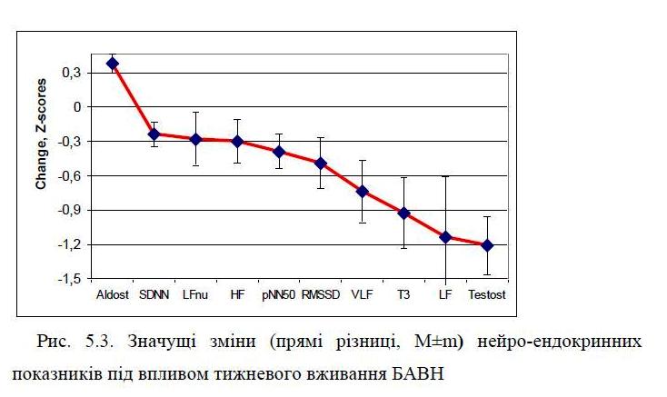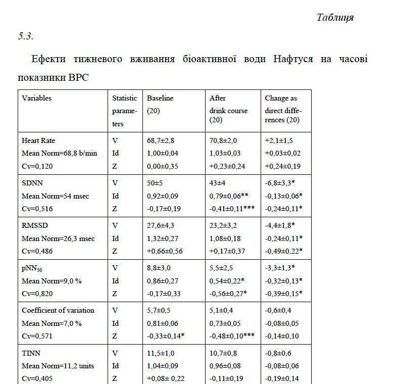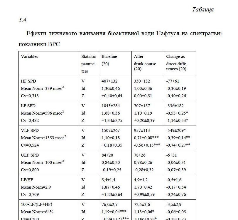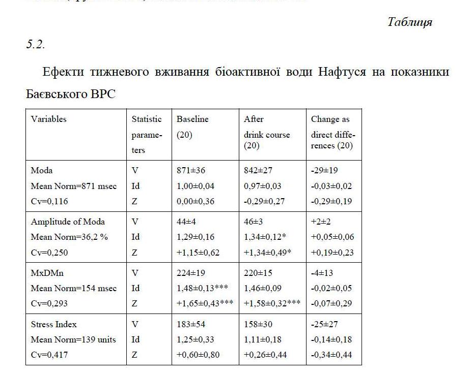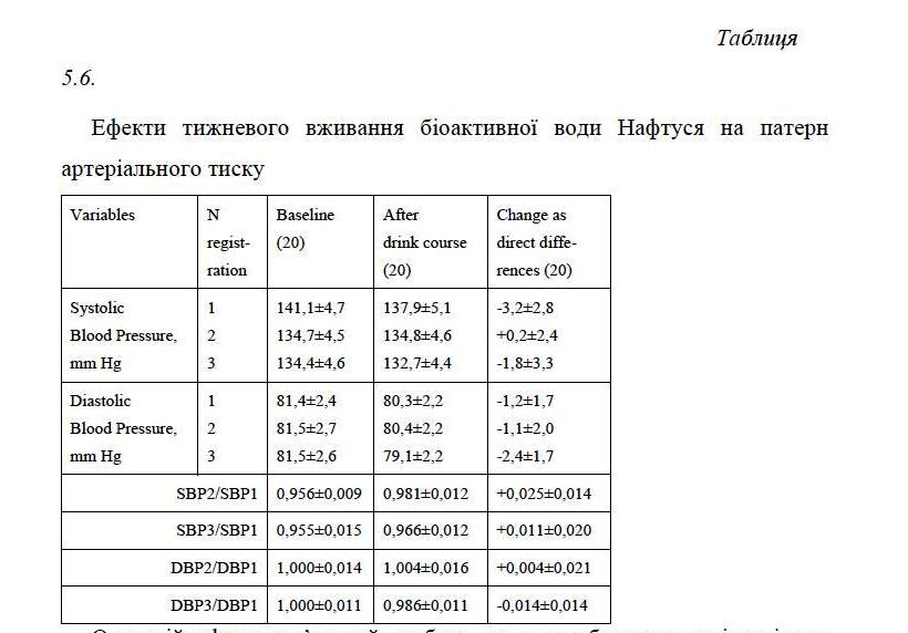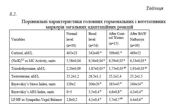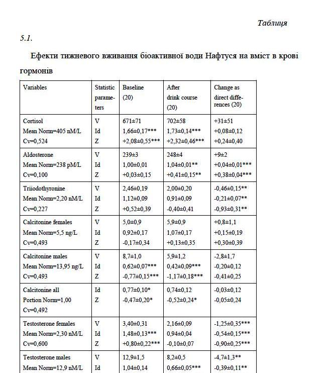 In clinical-physiological monitoring of individuals of both sexes with dysfunction of neuro-endocrine-immune complex as a manifestation of chronic stress found that weekly consumption Naftussya normalizes initially raised: Baevskiy’s activity of regulatory systems index, markers as sympathetic and vagal tone as well as testosterone in women, while initially normal levels of testosterone in men falls into the bottom zone rules. Lowering within the standards area also found on triiodothyronine. On the other hand, found a slight increase in the normal levels of aldosterone and post occlusive systolic blood pressure reactivity as well as tend to increase within the low reactive anxiety.