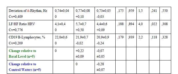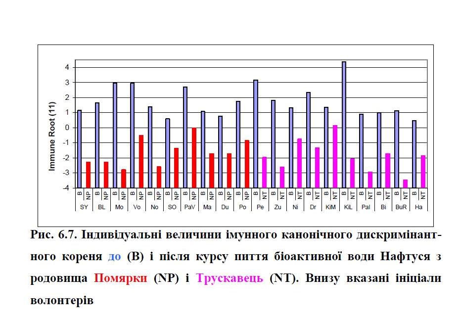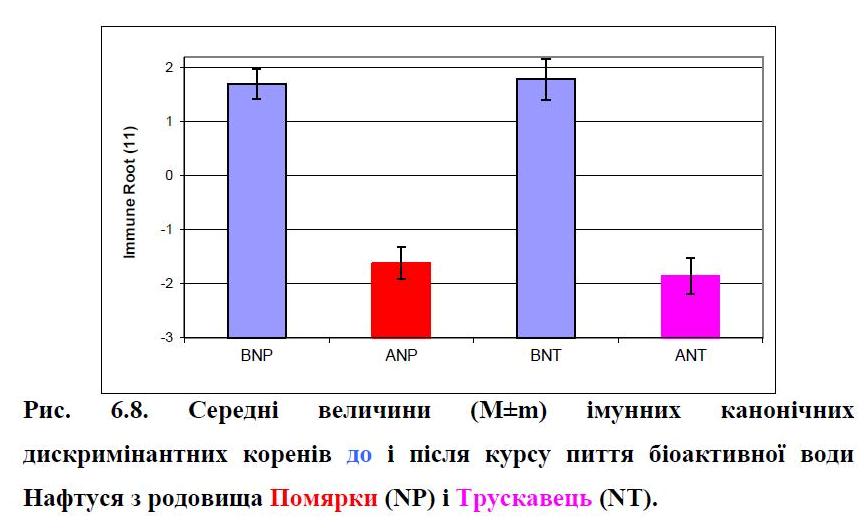 A comparative study of immediate effects in men with dysfunction of the neuro-endocrine-immune complex by discriminant analysis selected 38 indicators. In their totality the complex conditions in the basal period and after 1,5 hours after consuming the control waters (distilled, from the well and filtered water) and waters Naftussya (from Pomyarky, Truskavets’ and Skhidnytsya deposits) significantly differ, whereas no significant differences between control and basic water were found. Thus, the bioactive water Naftussya 1,5 h after ingestion causes changes in the neuro-endocrine-immune complex, different from both the initial level and the control.