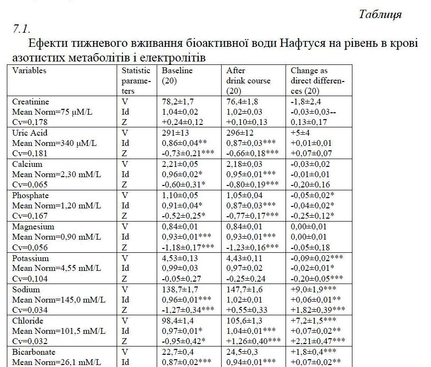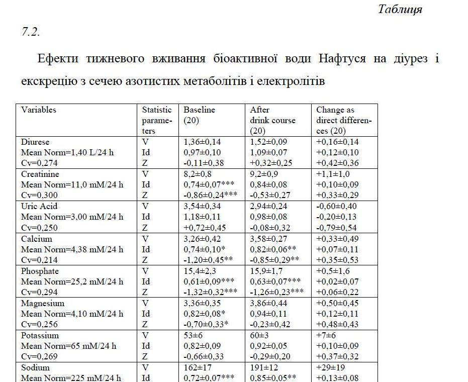 Among the metabolic parameters discovered that Naftussya increases within the normal plasma levels of chloride and sodium, normalizes low levels of bicarbonate and reduces in the normal levels of potassium and phosphates. Urinary excretion of sodium and chloride increases while of uric acid decreases which lowers its concentration, as the concentration of phosphates. Increased lithogeniciti index of urine normalized. Reduced levels of triacylglycerides increases, while decreases in the normal level of cholesterol in low-density lipoprotein composition.