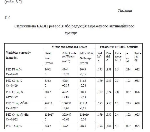 Received priority data about stress limiting effects of bioactive water Naftussya Pomyarky field in experiment on rats and its immediate and long-term effects on neuroendocrine-immune complex and water and electrolyte exchange in patients with dysfunction of the neuroendocrine-immune complexes together with known data of physical, chemical and bacteriological studies give reason to believe the water closest analogue of bioactive water Naftussya Truskavets’ deposit and recommend to include it in the balneologic arsenal spa Truskavets’.