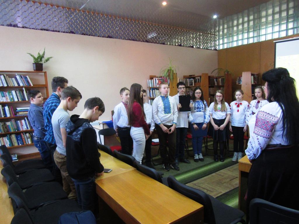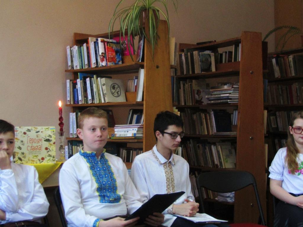 З тривогою та болем у серці Юля Федитник зачитала власний вірш «Війна», а Владислав Шукель власний твір «Україна». Зі сльозами на очах всі присутні послухали вірші про наших героїв, які зачитали Віра Веселовська, Владислава Крейз, Ярина Пасемко, Андрій Тачівка, а також переглянули відеоматеріали “На варті неба”, “Реквієм за Небесною Сотнею” про події, які відбувалися на Майдані.