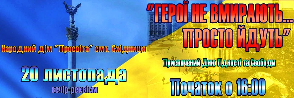 Як інформує прес-служба Східницької селищної ради, у неділю, 20 листопада, в Східниці відзначать День Гідності та Свободи. З метою вшанування громадянської мужності учасників подій Помаранчевої революції та Революції Гідності у відстоюванні прав людини та європейського майбутнього України у Народному домі «Просвіта» пройде вечір-реквієм «Герої не вмирають… Просто йдуть».
