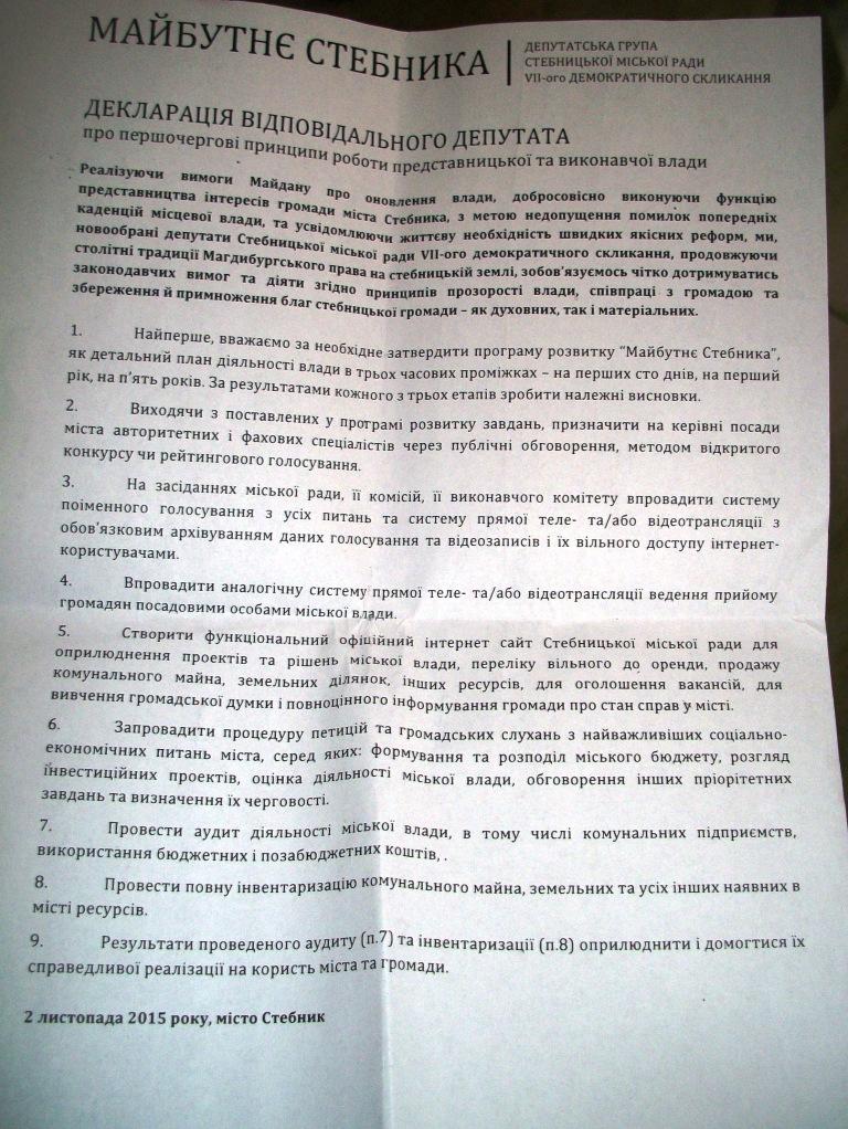За попередньою інформацією, на посаду секретаря ради можуть бути висунуті Андрій Петруняк від «Батьківщини» та Іванна Дідошак від «Народного контролю», заступником міського голови можуть бути Іван Гайванович та Олег Ковальчин, а керуючим справами – Володимир Годяк. Та консультації, узгодження, обмін думками тривають – процес остаточної кристалізації влади у Стебнику ще не завершився.