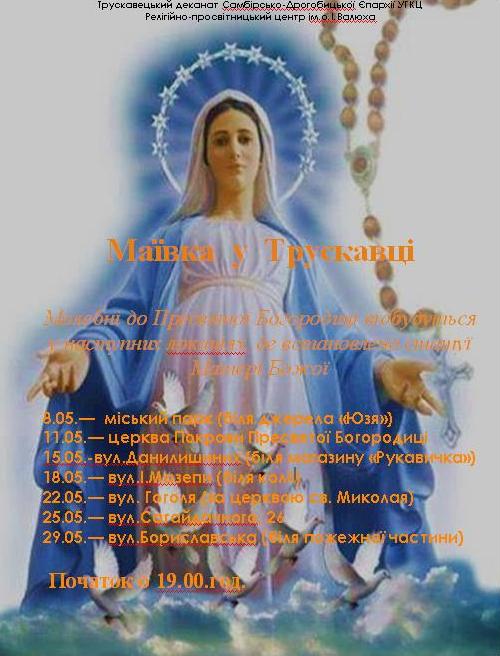 Трускавецький деканат Самбірсько-Дрогобицької єпархії УГКЦ та Релігійно-просвітницький центр ім. о. Івана Валюха вирішили цьогоріч провести «маївки» «на виїзді». Так, молебні до Пресвятої Богородиці відбудуться у тих локаціях, де встановлено статуї Матері Божої, а саме:
