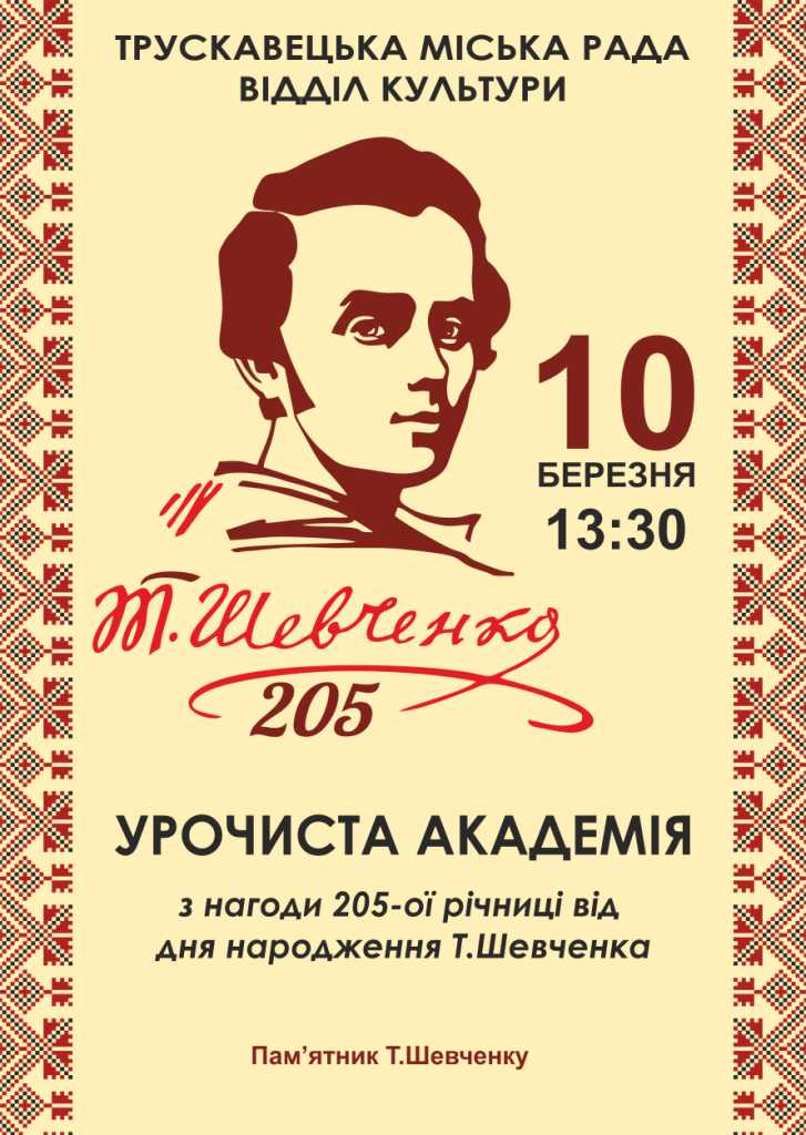 У Трускавці, як і по всій Україні, відзначать Шевченківські дні. Урочиста академія з нагоди 205-ї річниці від дня народження Великого Кобзаря та 158-ї річниці від дня його смерті пройде у неділю, 10 березня, о 13.30 біля пам’ятника Т. Шевченку. А о 14.00 в Палаці культури імені Шевченка виступить з концертом Національна Заслужена капела бандуристів імені Георгія Майбороди (художній керівник та головний диригент – народний артист України Юрій Курач). Вхід вільний.