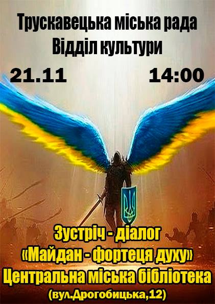 З нагоди Дня Свободи та річниці Революції Гідності у Трускавці пройде зустріч-діалог на тему «Майдан – фортеця духу». Захід відбудеться 21 листопада о 14.00 в центральній бібліотеці Трускавця (вул. Дрогобицька, 12). Модератор заходу – Андрій Юркевич.