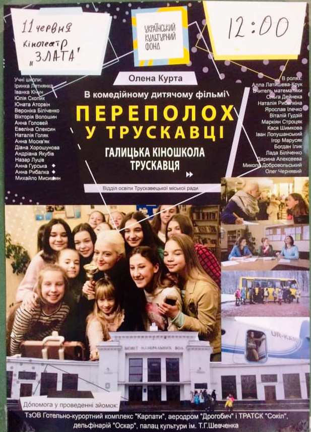11 червня (вівторок) у Трускавці покажуть фільм «Переполох у Трускавці». Зйомки фільму проходили минулого року, а в ролі акторів попробували себе діти-вихованці «Галицької кіношколи». Дитяча комедія постала завдяки фінансуванню Українського Культурного Фонду. Переглянути кінострічку можна в кінотеатрі «Злата» о 12.00, вхід вільний.