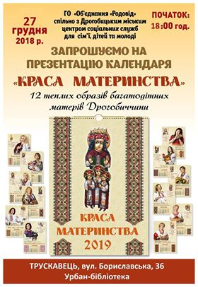У четвер, 27 грудня, в УРБАН-бібліотеці Трускавця (вул. Бориславська, 36) відбудеться презентація соціального проекту «Краса материнства». Це надзвичайно цікавий і красивий календар на 2019 рік, на кожній сторінці якого розміщена фотографія багатодітної матері з Дрогобиччини, ангели-хоронителі від Левка Скопа та вірші-присвяти тим унікальним жінкам від Василя Кузана. Ідейною натхненницею та організатором проекту є Оксана Рудавська та ГО “Родовід”. Початок презентації о 18.00.
