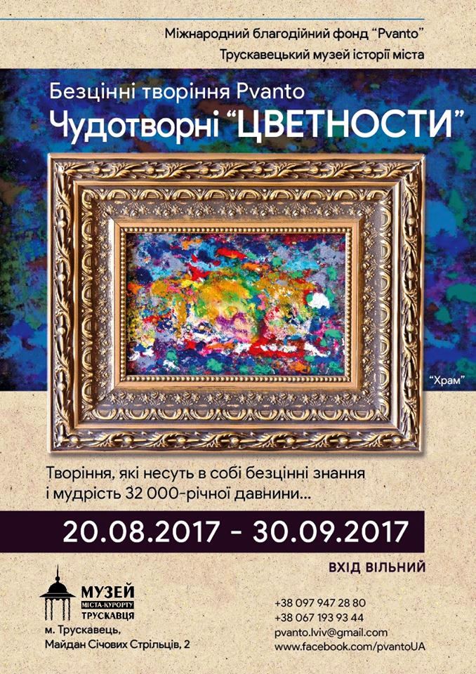 Як інформує наше власне джерело, у Трускавці буде відкрито виставку чудотворних «цвєтностей», про які на «Трускавецькому віснику» можна почитати більше за посиланням http://protruskavets.org.ua/svyatoslav-lob-pvanto-i-kolorovosti/. Окрім закритого заходу, який пройде в одній з вілл Трускавця, «цвєтності» виставлятимуться і в музеї історії міста-курорту (відкриття виставки пройде 20 серпня о 17.00). Експозиція складатиметься з робіт, які вже презентувалися в таких обласних центрах як Дніпро, Кропивницький, Одеса, Полтава та Хмельницький.