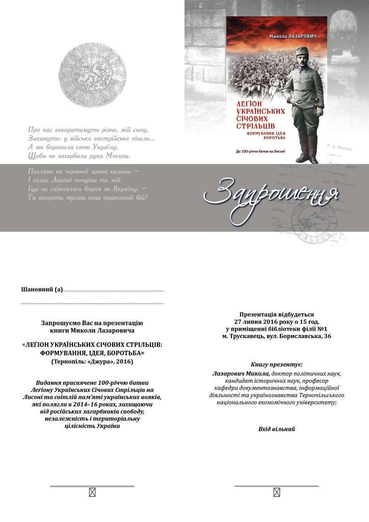 У середу, 27 липня, в Трускавецькій бібліотеці-філії № 1 (вул. Бориславська, 36) буде презентовано книгу Миколи Лазаровича «Легіон Українських Січових Стрільців: формування, ідея, боротьба». Видання презентує автор, доктор політичних наук, кандидат історичних наук, професор Тернопільського національного економічного університету Микола Лазарович. Початок презентації – о 15.00.