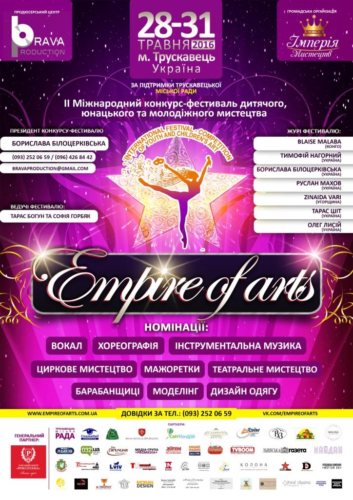 28-31 травня 2016 р. у Трускавці відбудеться ІІ Міжнародний конкурс-фестиваль дитячого, юнацького та молодіжного мистецтва «EMPIRE OF ARTS» («Імперія мистецтв»). Про це інформує Президент фестивалю Борислава Білоцерківська.