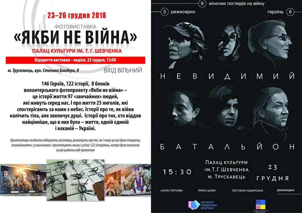 У неділю, 23 грудня, у Трускавці в Палаці культури ім. Т. Шевченка відкриється фотовиставка «Якби не війна». Виставка підготовлена волонтерами і розповідає про 122 історії «звичайних людей», в тому числі 25 тих, хто загинув. Початок роботи фотовиставки – о 13.00.