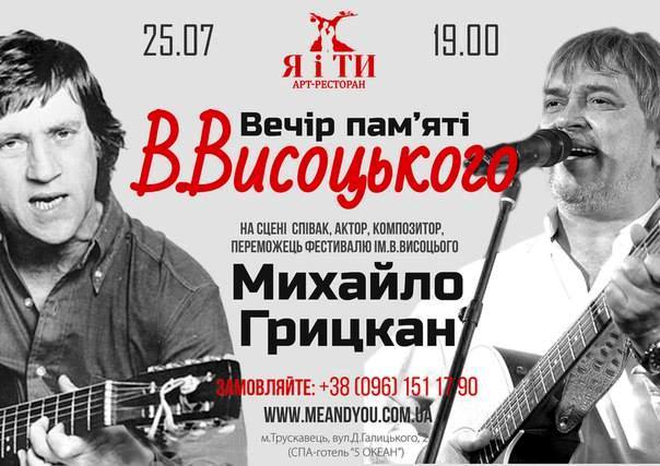 У суботу, 25 липня, в трускавецькому арт-ресторані «Я і Ти» (вул. Д. Галицького, 2) відбудеться вечір пам`яті Володимира Висоцького. Участь у вечорі візьме співак, актор, композитор Михайло Грицкан. Розпочнеться вечір пам`яті В. Висоцького о 19.00.