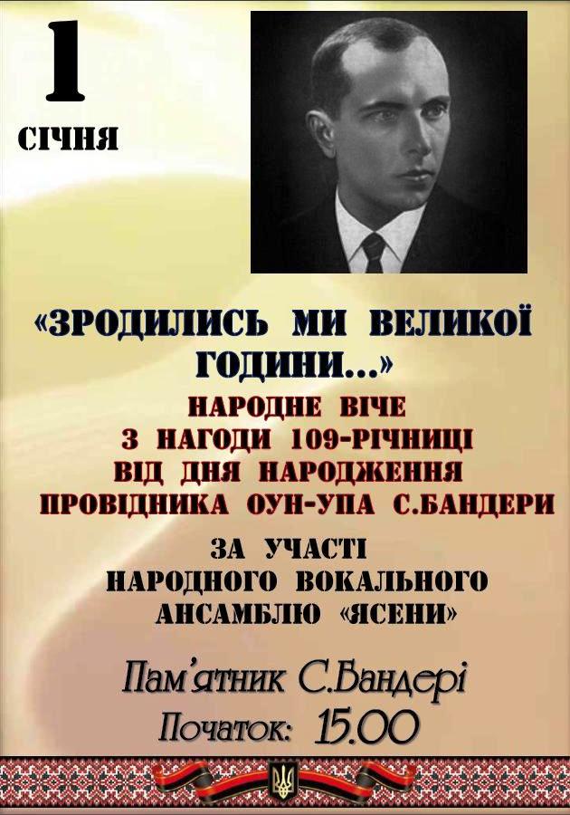 1 січня минає 109 років від дня народження Провідника ОУН Степана Бандери. З нагоди цієї дати у Трускавці 1 січня о 15.00 біля пам’ятника Степанові Бандері пройдуть урочисті заходи, організовані відділом культури ТМР. У віче «Зродились ми великої години…» візьме участь народний вокальний ансамбль «Ясени».