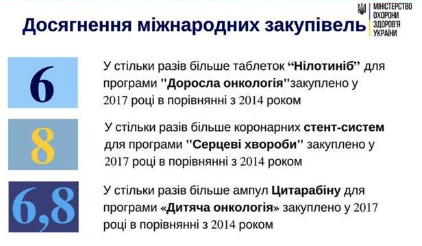 Наприклад, вакцина від поліомієліту «Імовакс» того ж самого виробника, в якого раніше закуповувало МОЗ, була закуплена ЮНІСЕФ у 8 разів дешевше напряму у виробника. У 2014 році МОЗ закупило 12 554 дози цієї вакцини у дистриб’ютора за ціною $7,35, а у 2016 році ЮНІСЕФ купив в 11 разів більшу кількість доз – 143 800 доз за ціною $0,89. Препарат для лікування раку крові «Нілотиніб» у 2014 році був закуплений у кількості близько 37,5 тисяч таблеток, а минулого року закупили в шість разів більше – понад 230 тисяч. Це дає можливість допомогти значно більшій кількості пацієнтів.