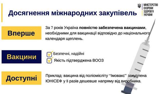 Закупівлі ліків через міжнародні організації дозволили стабілізувати постачання вакцин і вперше за сім останніх років всі вакцини, необхідні відповідно до національного календаря щеплень, є в наявності. Це надійні вакцини, якість яких підтверджена Всесвітньою організацією охорони здоров’я. Окрім того, буде створено буферний 25% запас вакцин, а самі вакцини почнемо замовляти на три роки наперед, що дозволить уникнути перебоїв з їх постачанням у майбутньому.