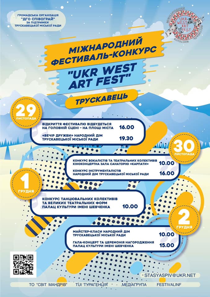 У четвер, 29 листопада, у Трускавці стартував чотириденний Міжнародний фестиваль «UkrWestArtFest». Міжнародний, бо участь в ньому беруть представники не лише 12 областей України, а й міста Бобруйськ з Республіки Білорусь. Цей фестиваль у Трускавці проходить вже втретє, його організатором є ГО «Співограй» (керівник Станіслава Котелянська).