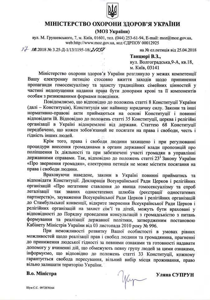 Але зовсім не тема уринотерапії, в якій пані міністр проявила таку «компетентність», і не інші «навчальні» та «роз`яснюючі» пости Уляни Супрун змінюють особисто моє ставлення до неї з позитивного на негативне. Вражає відповідь пані міністр громадянину України, християнинові-протестантові Вікторові Танцюрі, в якому той закликав припинити пропаганду гомосексуалізму та захистити традиційні сімейні цінності. Захисникові традиційних сімейних цінностей недвозначно натякають – якщо йому не подобається політика чинної влади щодо «захисту прав» різного роду збоченців, то він може виїхати з України. В принципі, зрозуміло, Супрун заїхала – Танцюра хай виїжджає. Те, що пані міністр залишається громадянкою іноземної держави і водночас є посадовою особою в нашій державі, де подвійне громадянство заборонене, лише додає пікантності цій ситуації.