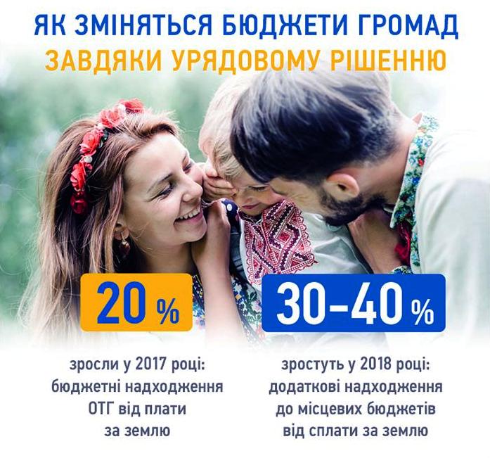 Завдяки ініціативі Уряду відтепер не чиновники, а самі громади прийматимуть рішення, які сприятимуть розвитку сільськогосподарського виробництва, залученню інвестицій, суттєво збільшать надходження до місцевих бюджетів. Також децентралізація земельних відносин дозволить побороти проблему корупції в цій сфері. Рада громади сама визначає ставку земельного податку, 100% якого залишається в місцевому бюджеті.