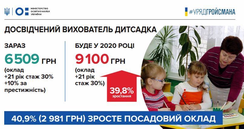 – досвідчений вихователь дитсадка зі стажем 21 рік, який зараз отримує 6509 грн (оклад+надбавки за стаж та престижність), у 2020 році буде отримувати 9100 грн (оклад+стаж). Тобто його зарплата зросте на 40%.