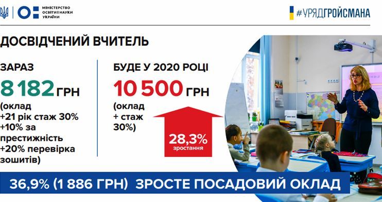 – досвідчений вчитель зі стажем 21 рік зараз отримує 8 182 грн, в наступному році буде отримувати 10 500 грн. Тобто його зарплата зросте на майже 30%.