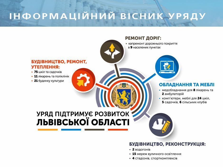 У Львівській області виділені урядом кошти будуть використані на будівництво, ремонт та утеплення понад майже сотні садочків, шкіл, спортивних об’єктів та об’єктів культури. Зокрема, виділені кошти на: