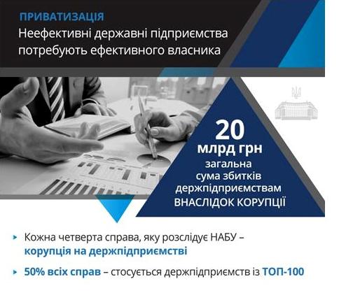 Серед майже 400 проваджень, розслідування яких здійснює НАБУ, понад 100 стосуються корупції на держпідприємствах. Половина з них входить в ТОП-100 держкомпаній. Сумарні збитки, завдані цим підприємствам внаслідок кримінальних корупційних правопорушень, перевищують 20 млрд грн.
