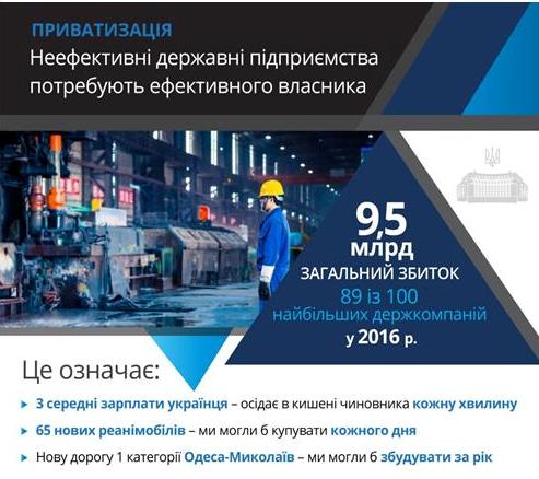 – В Україні наразі налічується 3,5 тисячі державних підприємств. Для країни це є нонсенс, оскільки ці підприємства формують збитки для держави і прибутки для тих, хто годується навколо цих підприємств роками. Зміна законодавства дозволить вирівняти ситуацію, залучити нових власників, технології, створити нові робочі місця. Ухвалення нового закону про приватизацію державного майна важливе для економічного зростання. І це буде самий міцний наш крок щодо антикорупційної політики в державі. Державний сектор є найбільшим джерелом корупції в Україні. Ми маємо це визнати і ліквідувати. Сьогодні ми говоримо про впровадження конкурентних і прозорих процедур. Разом з тим ніхто і ніколи не збирається продавати стратегічні підприємства. Там ми забезпечимо ефективне управління.