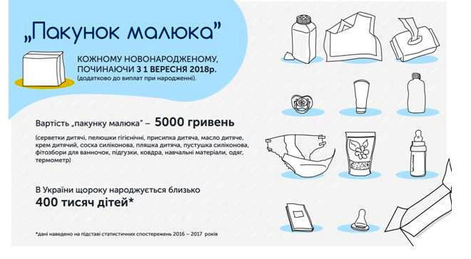 З 1 вересня 2018 року батьки новонароджених отримають додаткову допомогу від держави – «пакунок малюка». Кожна мама отримає в пологовому будинку для своєї дитини пакунок з найнеобхіднішими для малюка речами – це одяг, підгузки, ковдри, дитяча олійка та крем, присипка, пляшечка, соска, пустушка, серветки, пелюшки, термометр, а також навчальні матеріали щодо догляду за дитиною. Кожна дитина, з 400 тисяч, які щороку народжуються в Україні, отримає від держави речі, які потрібні в перші дні життя.