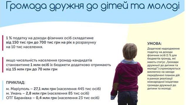 Уряд стимулює отримання громадами статусу ЮНІСЕФ «Громада дружня до дітей та молоді». Громади, міста, що матимуть такий статус, зможуть розраховувати на додаткові надходження до своїх бюджетів, які можна спрямувати на розвиток дитячої інфраструктури, створення комфортних умов для розвитку та навчання дітей. З наступного року громади, дружні до дітей, отримають до своїх бюджетів додаткові надходження податку на доходи фізичних осіб (ПДФО) в розмірі 1% – це 150-700 тисяч грн. на рік в розрахунку на 10 тисяч населення. Великі громади, населення яких складає 1 мільйон осіб, отримають додатково до бюджетів від 15 до 70 млн.грн.