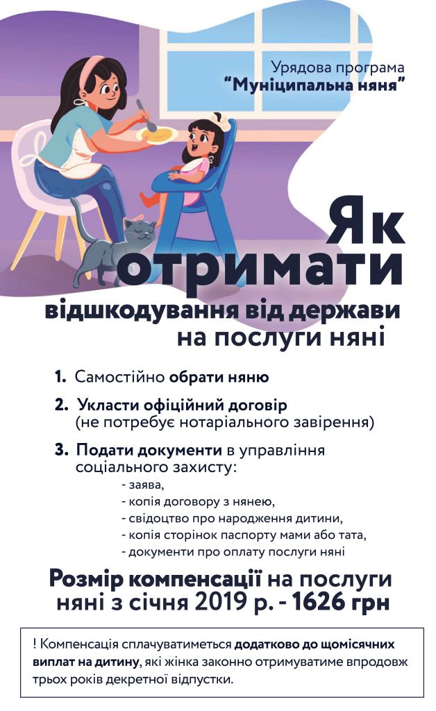 З 2019 року в Україні запрацював ще один вид соціальної допомоги новоспеченим батькам – «муніципальна няня». Це додаткова грошова допомога від Уряду молодим сім’ям.