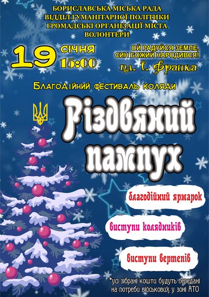 На свято Хрещення Господнього, 19 січня, у Бориславі на площі Івана Франка відбудеться благодійний фестиваль коляди. Також в цей день одночасно пройде благодійний ярмарок зі збором коштів для потреб військових у зоні АТО. Виступатимуть вокальні колективи, вертепи та сольні виконавці. Захід проходить за підтримки Бориславської міської ради, відділу гуманітарної політики, громадських організацій міста та волонтерів.