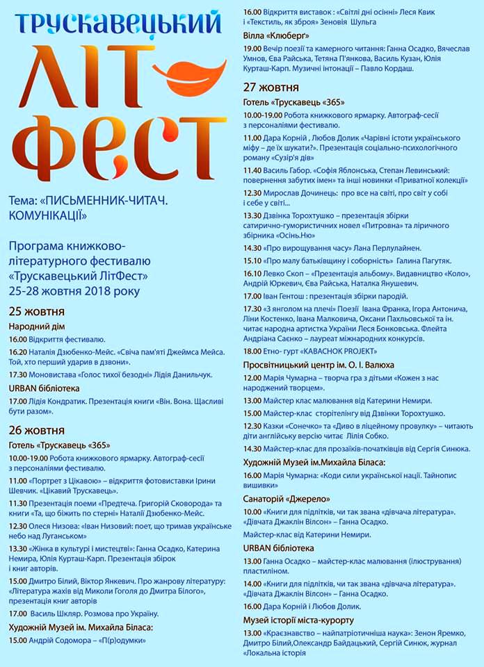 Відкриття «Трускавецького ЛітФесту» відбудеться у четвер, 25 жовтня, нижче подаємо детальну програму заходів.