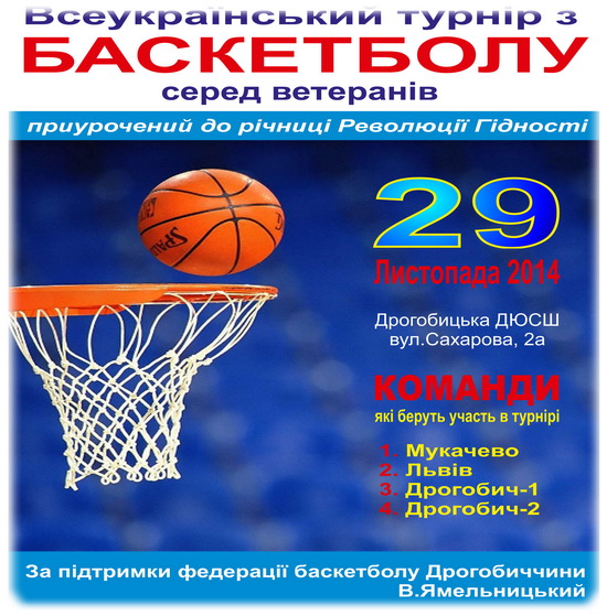Федерація баскетболу Дрогобиччини на чолі з Володимиром Ямельницьким організовує в Дрогобичі турнір, присвячений «Революції Гідності» і планує зробити його в майбутньому традиційним всеукраїнським серед ветеранів баскетболу України. Перший турнір відбудеться протягом одного дня, у ньому приймуть участь команди з міст Мукачевого, Львова та дві команди Дрогобича. Також під час турніру буде проведена акція зі збору коштів для сімей загиблих на Майдані з Дрогобиччини. Турнір відбудеться 29 листопада в спортивному залі ДЮСШ за адресою м. Дрогобич, вул. Сахарова 2а. Запрошуємо усіх любителів баскетболу та небайдужих людей долучитись до турніру-акції. Початок змагань о 10.00. Відкриття турніру о 12.00.