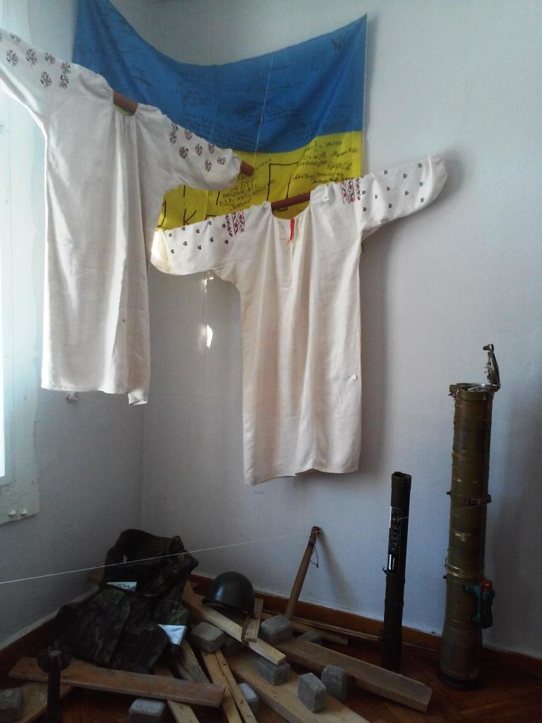 Колекція сорочок, представлена на виставці, належить ветерану Майдану та АТО бійцю «Айдару» Миколі Павлюченку, котрий врятував її в Старобільську. Вишиті білим по білому занизані мережкою сорочки, цікаві своїм оздобленням юпки (верхній одяг, легка вкорочена жіноча свита), прикрашені оксамитом керсетки (жіночий верхній одяг, без рукавів, пошитий у талію), пояси-крайки, костюми Слобожанщини ХІХ – початку ХХ століть – це унікальні речі культури українського Сходу країни. Вони представлені в експозиції поряд із реаліями сьогоднішнього Донбасу, атрибутами неоголошеної війни в Україні: маскувальною сіткою, бронежилетом, залишками снарядів від «градів»…