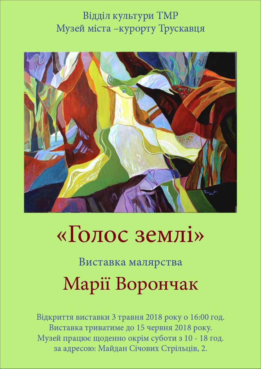 Почути голос землі та пропустити його крізь своє серце – таким творчим кредом послуговується художниця з міста Теребовлі, що на Тернопіллі, Марія Ворончак, яка 3 травня 2018 року о 16 год. буде презентувати свою мистецьку виставку «Голос землі» у стінах музею міста-курорту Трускавця.