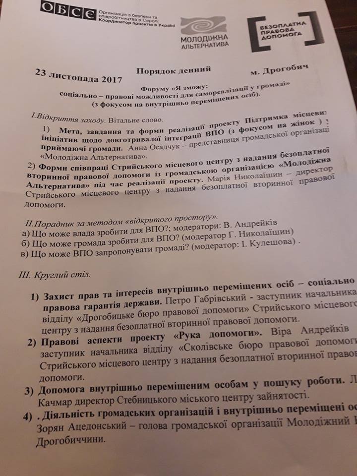 Тему внутрішньо переміщених осіб було обговорено 23 листопада у Дрогобичі на форумі «Я зможу: соціально-правові можливості для самореалізації у громаді». Організували форум у форматі круглого столу ГО «Молодіжна альтернатива» (голова Анна Осадчук) та Стрийський місцевий центр з надання безплатної правової допомоги (директор Марія Николаїшин). Участь в заході взяло близько трьох десятків осіб – депутати міської ради, керівники центрів зайнятості, юристи, підприємці, внутрішньо переміщені особи, журналісти. Тривав круглий стіл дві з половиною години.