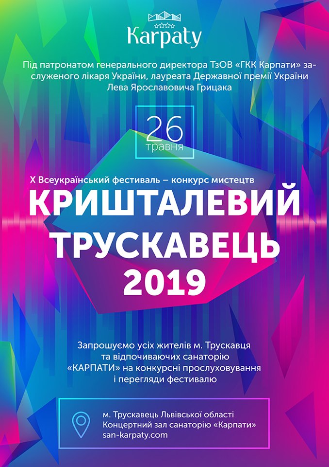 26 травня у Трускавці відбудеться Х Всеукраїнський фестиваль-конкурс мистецтв «Кришталевий Трускавець – 2019». Фестиваль проходитиме в концертному залі готельно-курортного комплексу «Карпати» (м. Трускавець, вул. Карпатська, 2).