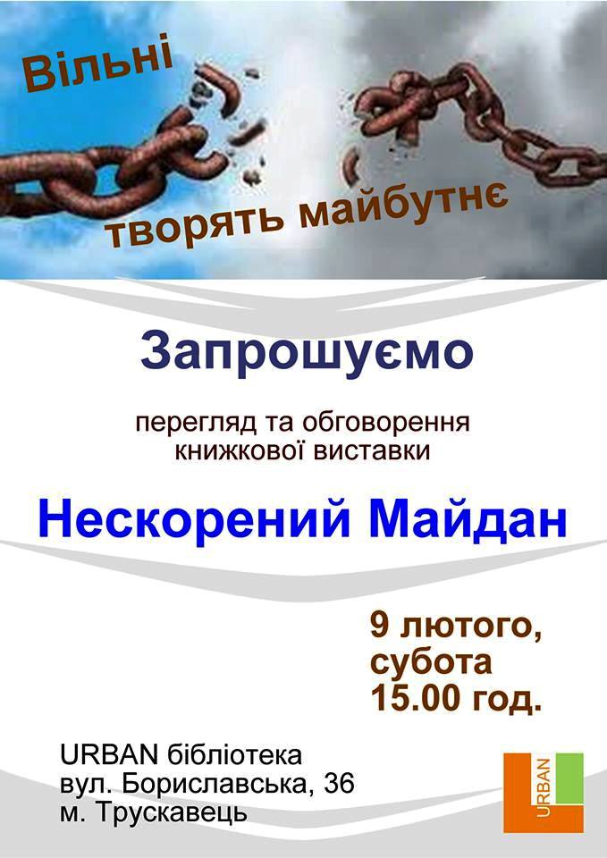 У суботу, 9 лютого, в УРБАН-бібліотеці Трускавця (вул. Бориславська, 36) відбудеться перегляд та обговорення книжкової виставки «Нескорений Майдан». Про це поінформувала завідувач УРБАН-бібліотеки Віра Савка. Співорганізатором заходу є Всеукраїнська ліга жінок (Трускавецький осередок очолює Катерина Ківацька).
