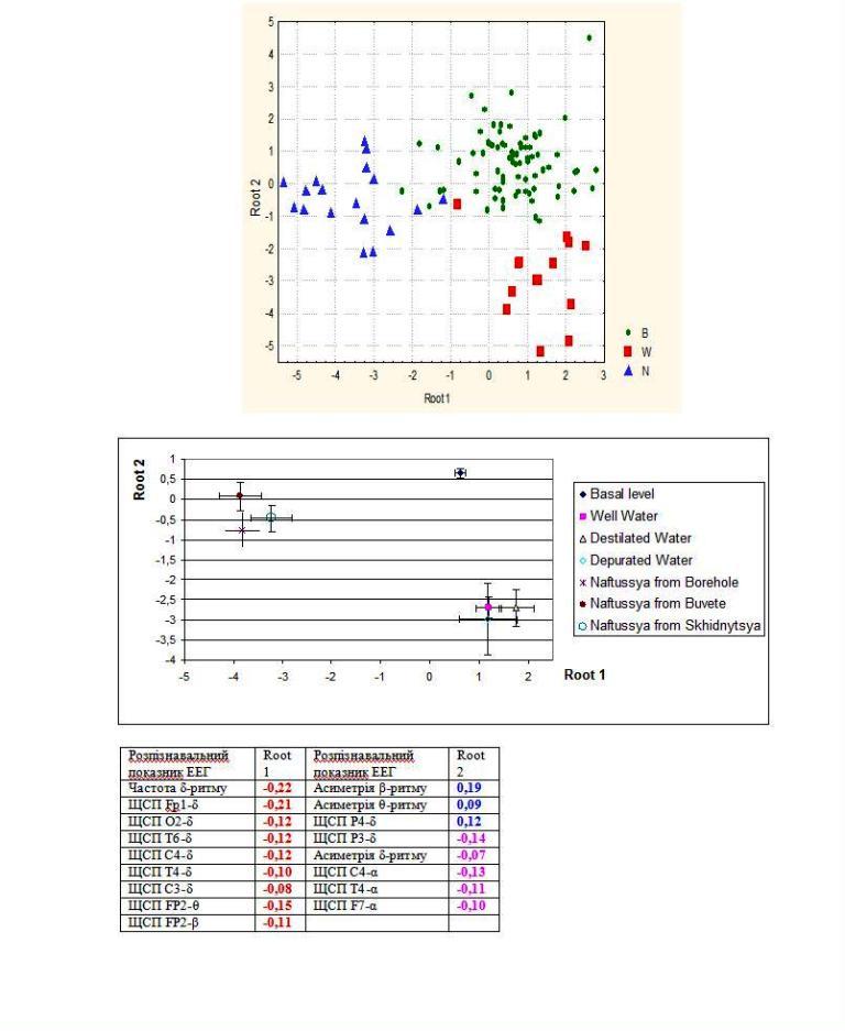 Інформація про розпізнавальні параметри ЕЕГ сконцентрована у двох коренях (Root), при цьому перший корінь містить 2/3 розпізнавальних можливостей, а другий – 1/3. Як бачимо, вздовж осі першого (мажорного) кореня біоелектрична активність мозку волонтерів після вживання контрольних вод (кластер із квадратів) не відрізняється від такої в стані спокою (кластер із овалів), натомість після вживання Нафтусі вона відчутно змінюється, про що свідчить зміщення кластера (в перекладі з англійської – грона) із трикутників вліво. Це відображує (дивіться таблицю) збільшення частоти дельта-ритму і його щільності спектральної потужності (ЩСП) у шести ділянках головного мозку, найбільшою мірою у лівій передній лобній, а також ЩСП тета- і бета-ритмів у правій передній лобній ділянці. Такі зміни свідчать про збудження мозкових структур, котрі активують пристосувально-захисні механізми організму. А саме в цьому і полягає суть цілющої дії Нафтусі! Судячи за середніми величинами першого кореня, цілюща дія Нафтусі, взятої як із свердловини Трускавецького родовища, так і з бювету, однакова і незначно, але все ж переважає таку Східницької Нафтусі!