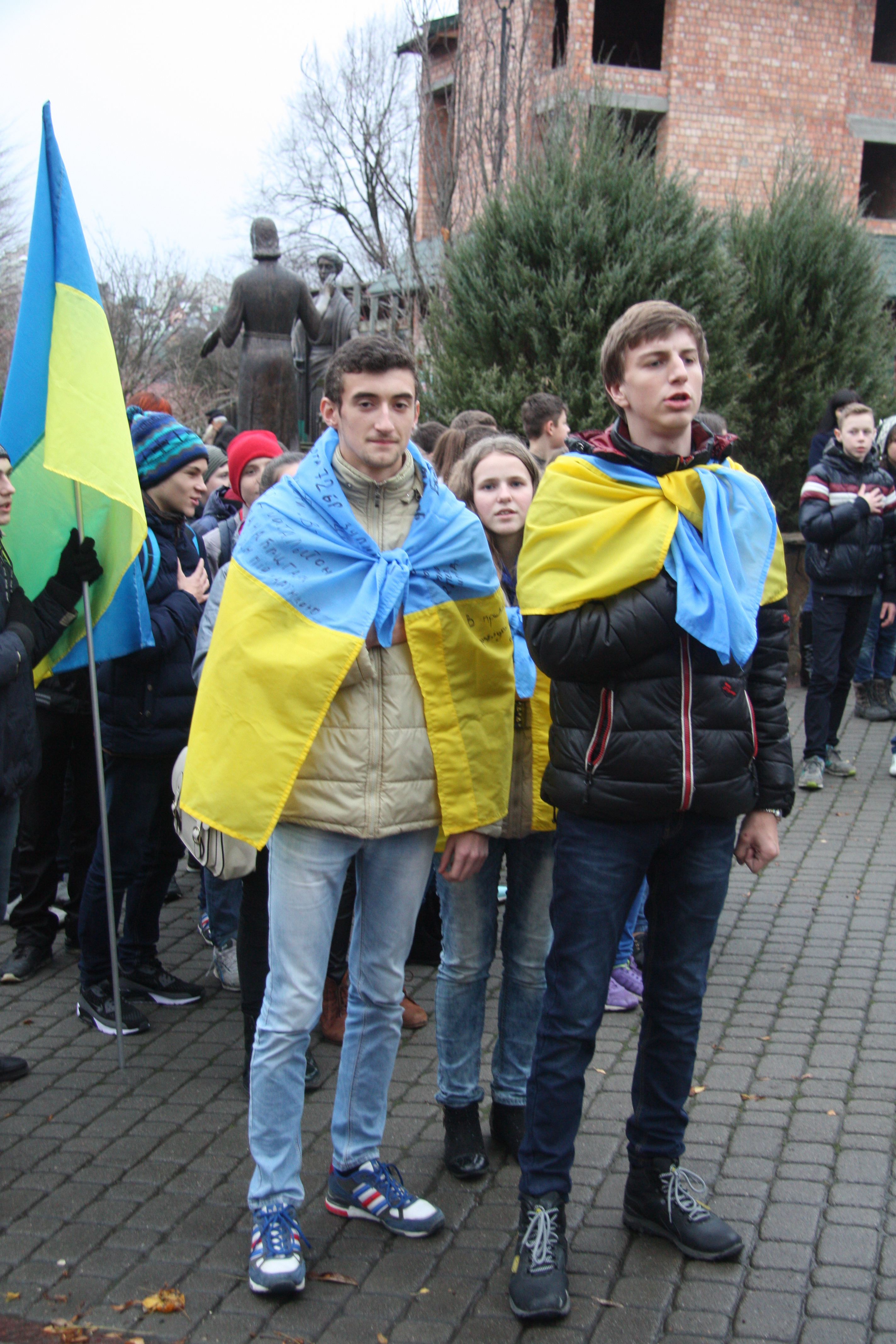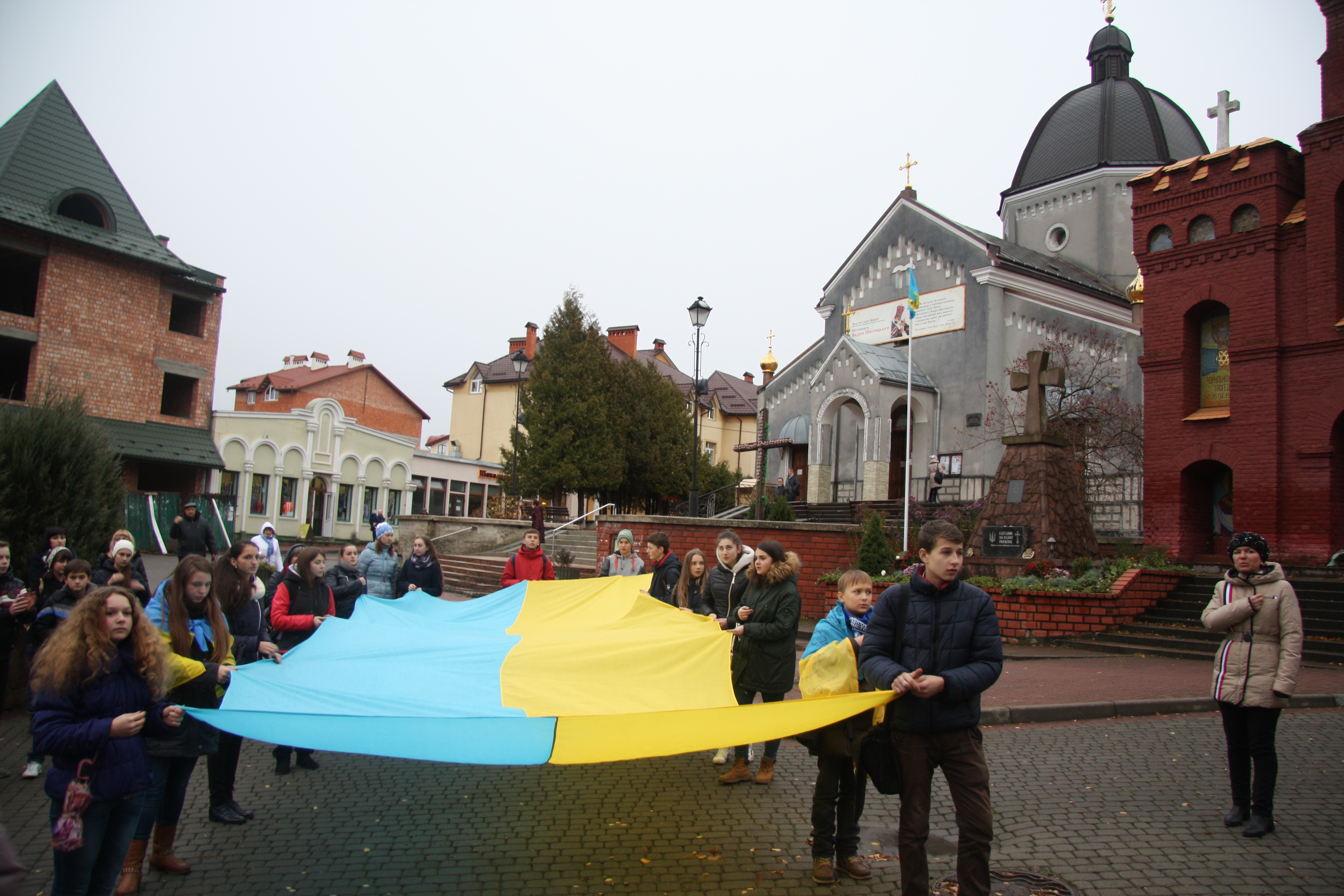 Мистецька акція продовжилась патріотичною ходою до стіни пам’яті Небесній Сотні. Дорогою учні СШ № 1 несли 10-ти метровий жовто-блакитний стяг та відповідали на патріотичні вітання перехожих. Коло церкви св. Миколая діти заспівали гімн і запалили лампадки в пам’ять про тих, хто був борцем за долю нашої Батьківщини до останнього подиху.
