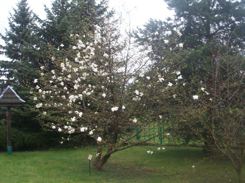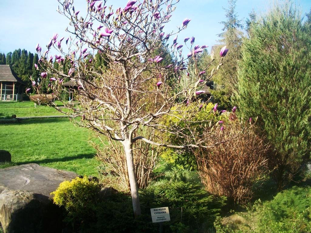 Розпускається і магнолія. Був такий французький садівник Шарль Магноль, який схрестив дерево і квітку. Як тільки підуть дощі і пригріє сонечко, тоді всі пуп`янки відкриються і магнолія зацвіте такими великими квітами.