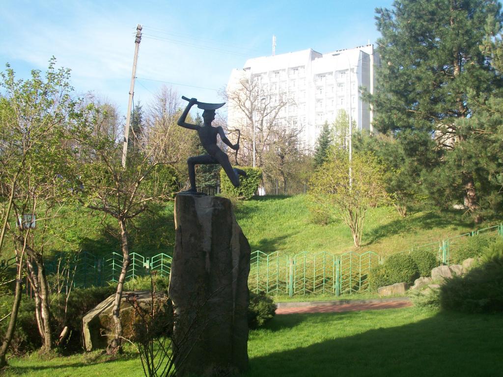 Ще один міфічний персонаж, якого зустрінемо в парку біля «Карпат» – слов`янський бог грому Перун. Це композиція «Біжучий Перун». В деяких регіонах України грім називають перуном, у польській мові слово «piorun» теж означає грім. В цій композиції Біжучий Перун тримає в руках змію – символ мудрості. У християнському світогляді подібним до Перуна є Ілля-громовержець, свято якого відзначають 2 серпня, як початок збору врожаю.