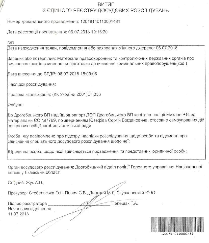 Відповідно до звернення «Справедливості» правоохоронними органами 6 липня ц.р. відкрито кримінальне провадження № 12018140110001481 стосовно самоуправних дії посадових осіб Дрогобицької міської ради. А 30 липня Сергій Юзефів як голова міського осередку «Громадсько-політичного руху В. Наливайченка «Справедливість» надав свідчення слідчому Дрогобицької відділу національної поліції щодо фактів, які можуть містити ознаки корупційних дій та зловживань з боку посадових осіб Дрогобицької міської ради.