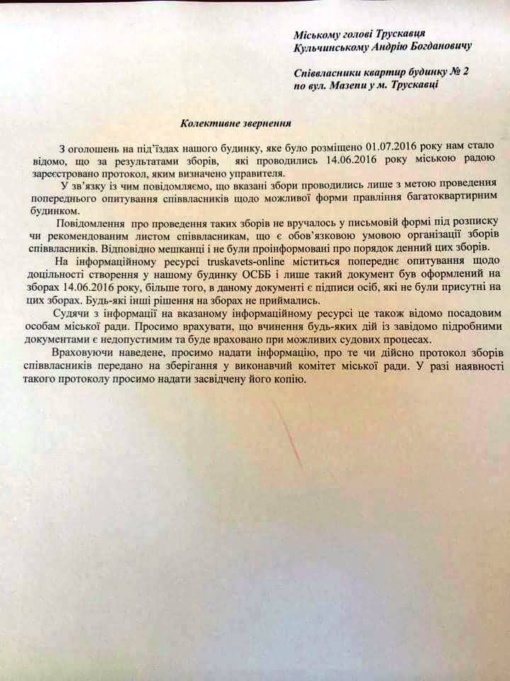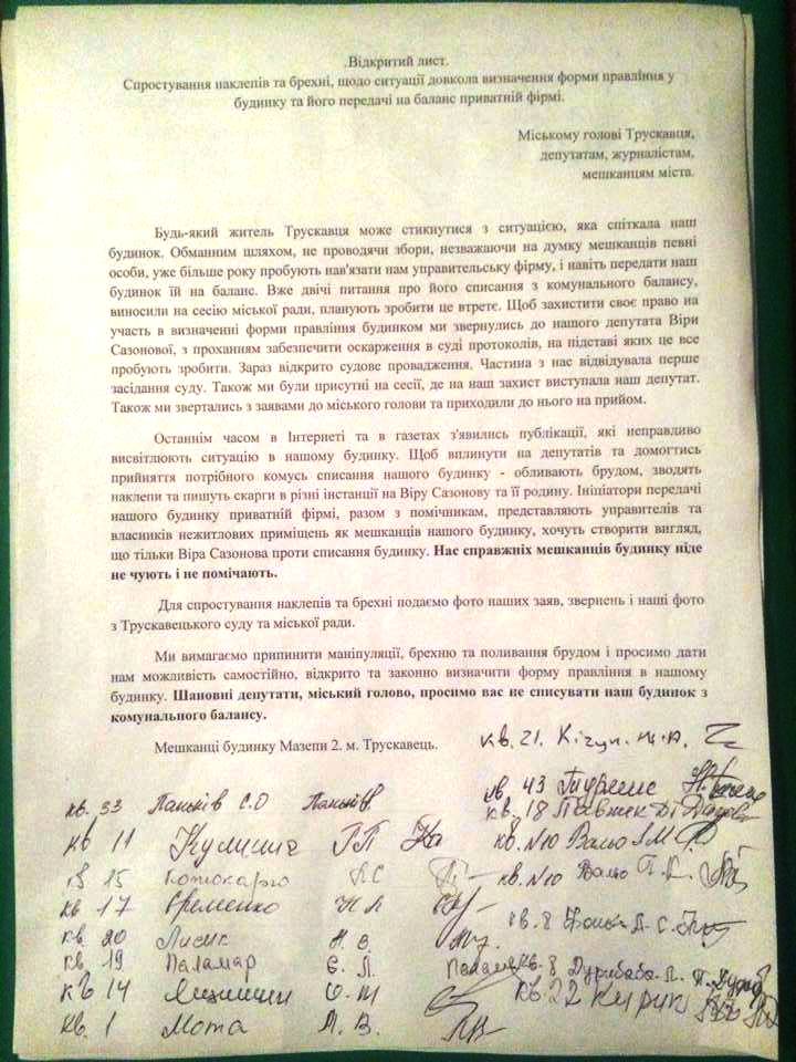 Будь-який житель Трускавця може стикнутися з ситуацією, яка спіткала наш будинок. Обманним шляхом, незважаючи на думку частини мешканців, певні особи уже більше року пробують нав’язати нам управительську фірму. Вже двічі питання про списання будинку з комунального балансу виносили на сесію міської ради, планують зробити це втретє. Щоб захистити своє право на участь у визначенні форми правління будинком ми звернулись до нашого депутата Віри Сазонової, з проханням забезпечити оскарження в суді протоколів, на підставі яких це все пробують зробити. Зараз відкрито судове провадження. Частина з нас відвідувала перше засідання суду. Також ми були присутні на сесії, де на наш захист виступала наш депутат. Також ми звертались з заявами до міського голови та приходили до нього на прийом.