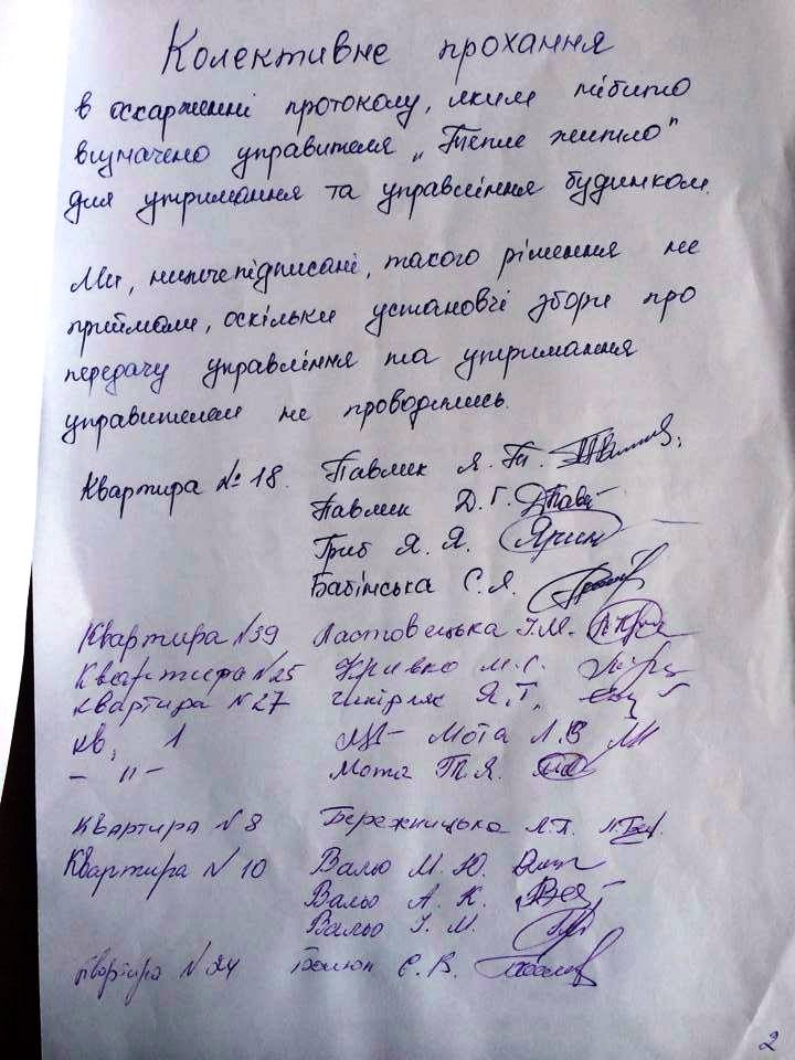 Ми просимо дати нам можливість самостійно, відкрито та законно визначити форму правління в нашому будинку. Шановні депутати, міський голово, просимо вас не списувати наш будинок з комунального балансу.