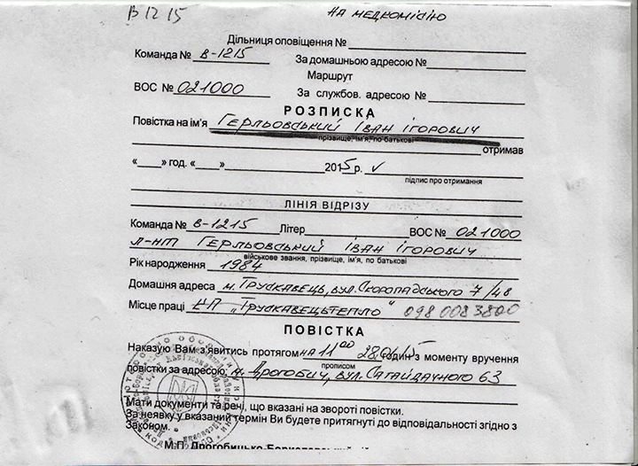 Вважаю, що такі «розваги» міського голови носять протиправний характер, такий, що ображає мою честь та гідність, ділову репутацію і репутацію депутата міської ради. Абсолютно не володіючи ситуацією, Р.Козир огульно звинуватив мене в ухилянні від призову до лав Збройних сил України. Образливим є також формулювання “розшукується”. Маючи всю можливість звернутися до правоохоронних органів для з’ясування мого місця знаходження, міський голова просто зробив висновок на своїх домислах. В період з 01.02.по 10.02.2015 р. я перебував в державній установі “Інститут серця МОЗ України”, який знаходиться у м. Києві по вул. Братиславській, 5-а. Про моє місцезнаходження підтверджує довідка від 10.02.2015 р. № 19-Х в якій сказано, що я знаходився в цей період по догляду за братом Герльовським В.І. Крім цього, про моє перебування в м. Києві засвідчують іменні квитки на фірмовий потяг № 050 Трускавець – Київ (дата виїзду 01.02.2015 р.) та на потяг № 743 Київ пасажирський – Львів (дата відправлення 10.02.2015 р.).